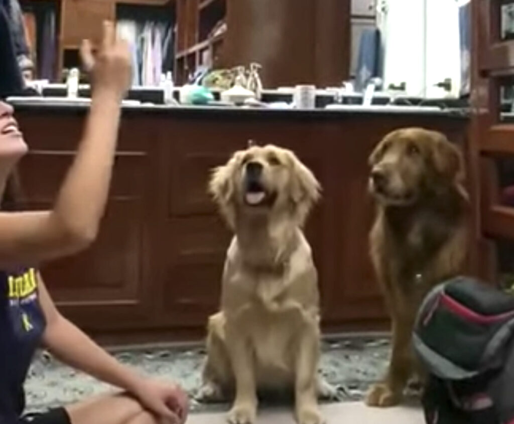 ボールを高くポーンと投げて 愛犬たちに見せている女性。 2匹のゴールデンレトリバーさんたちは 「これから何が始まるの?」とワクワク。 投げて遊んでくれるわけじゃないし、 これは一体...? じーっと辛抱してみていると 飼い主さんが投げたはずのボール... -