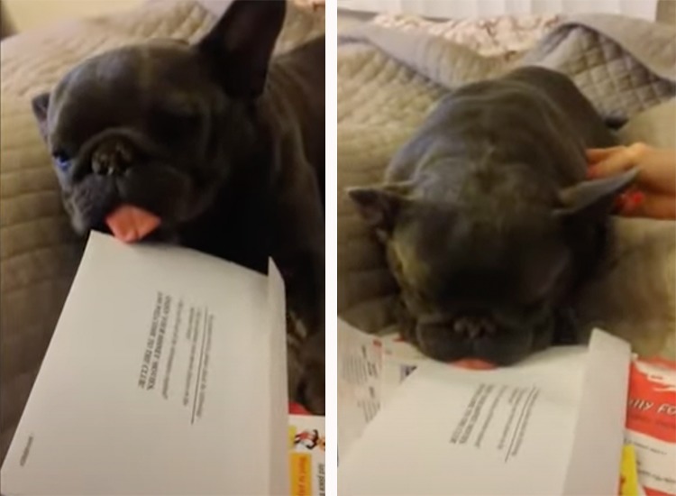ソファで寝ている犬さん、 たくさん置かれた郵便物の上で そのまま眠ってしまったようです。 飼い主さんが体を揺すって、 犬さんを起こしてあげようとすると... 寝ている時にお口から ペロッと舌が出てしまっていたため 顔をおいていたお手紙が ペタッとく...