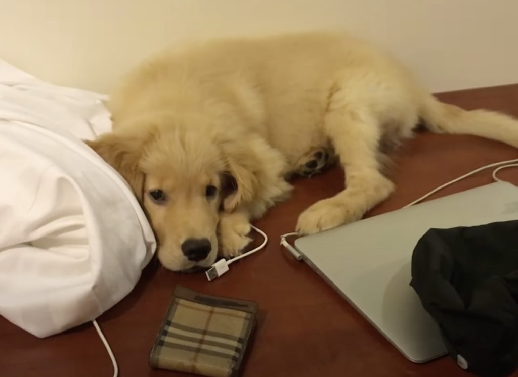 机の上で遊んでいるのは ゴールデンレトリバーの子犬、エマちゃん。 目の前にあった充電コードを 噛み噛みして遊んでしまい、 飼い主さんに「ダメ!」と怒られます。 怒られちゃった子犬さんは 「む〜っ!」っととっても分かりやすくスネちゃいました。 噛... -