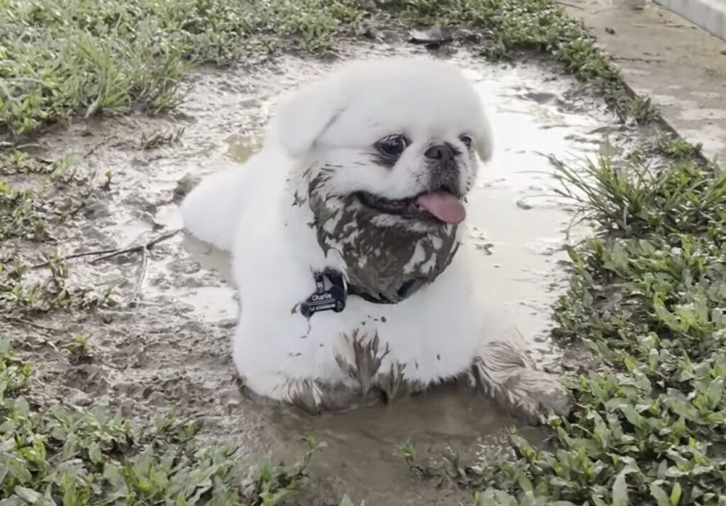 飼い主さんとお散歩していたパグさん。 真っ白な毛が可愛らしい犬さんですね。 飼い主さんがちょっと目を離した隙に、 よいしょっと、ひと休み〜♪ お散歩にちょっと疲れたのかな...って え!そこ、泥だらけの水溜まりじゃないかい! 飼い主さんがびっくり...