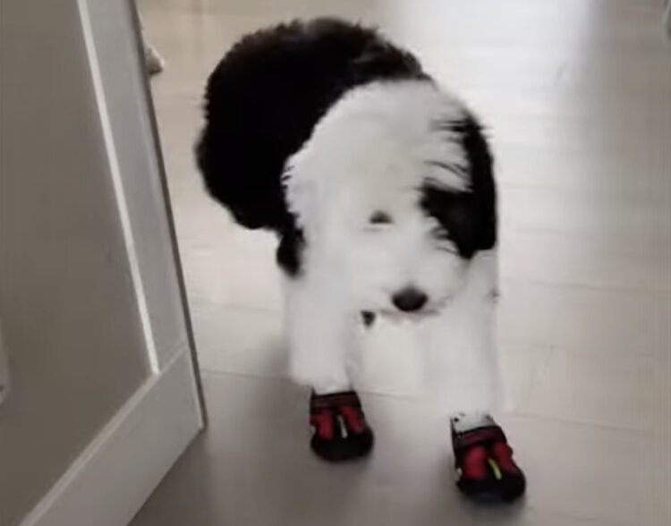 どぉ? 似合ってる? 新しい靴で得意げに歩く犬。