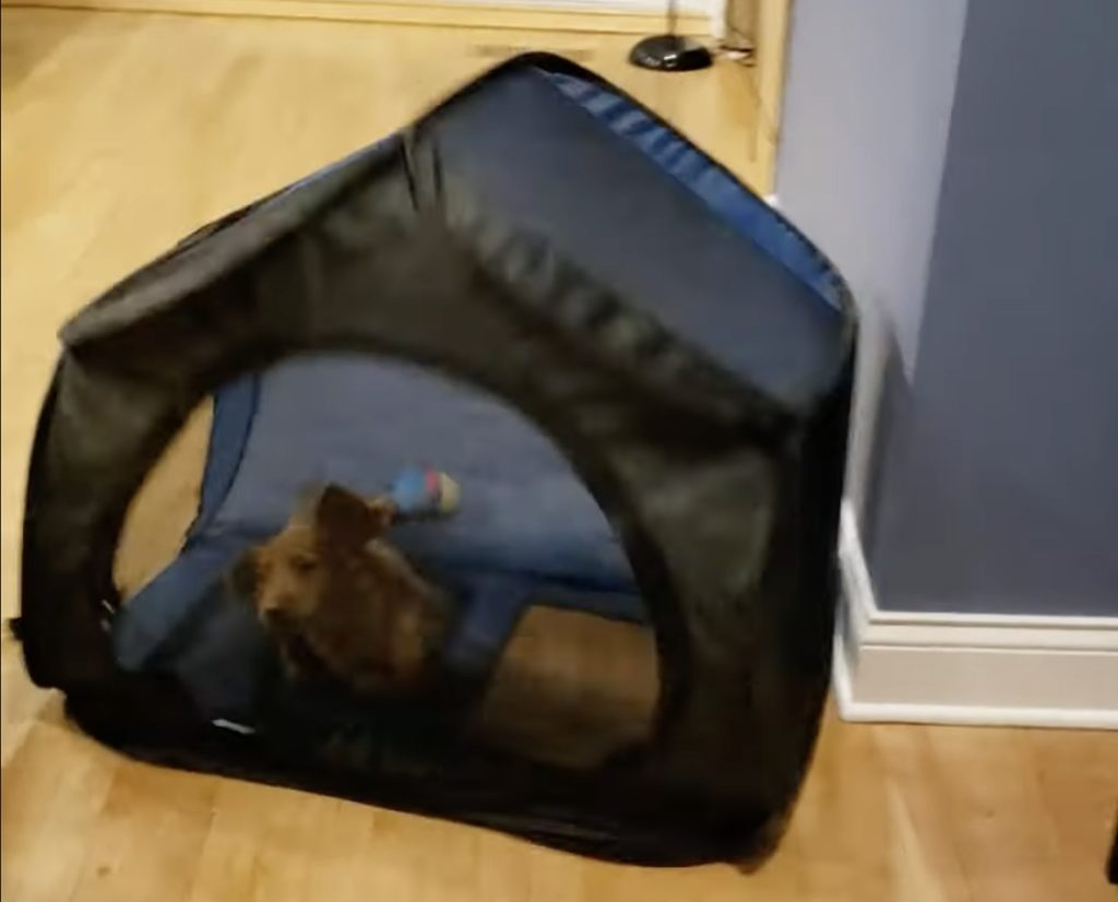 「脱走はしてないよ?」ケージごと移動してくる子犬。