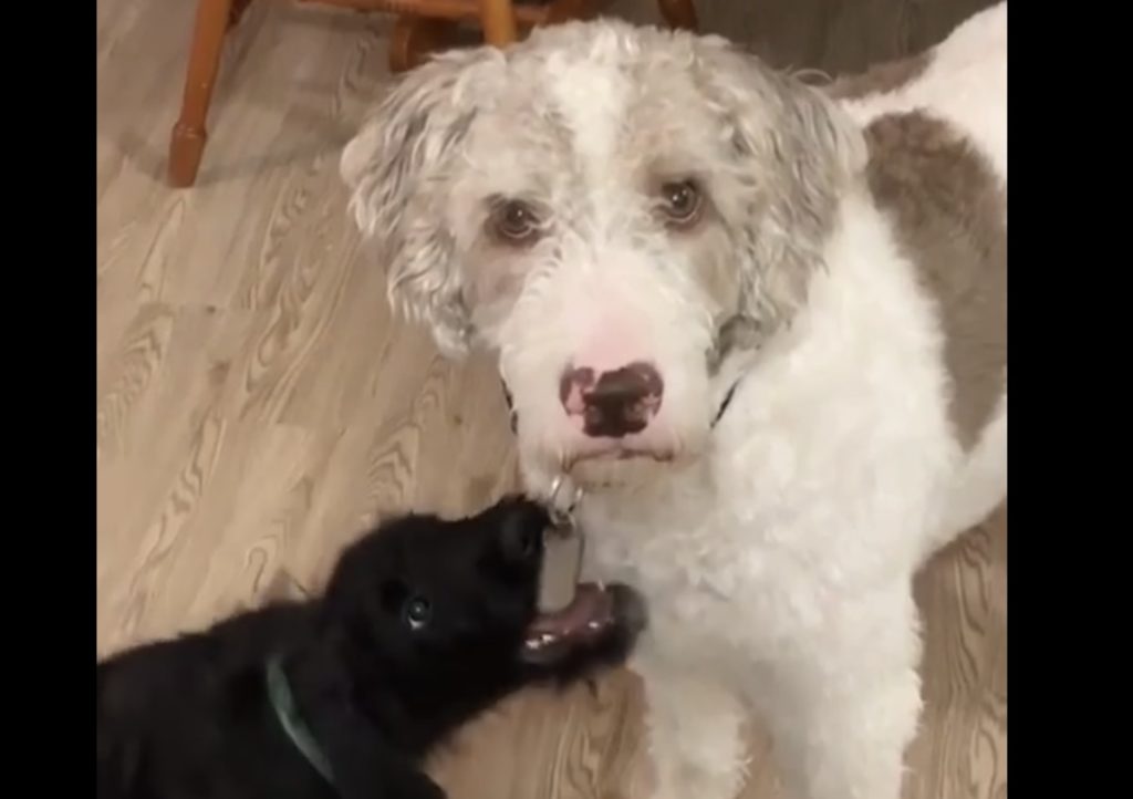 家族が増える事を知らなかった犬、新入り子犬を見て不機嫌に?