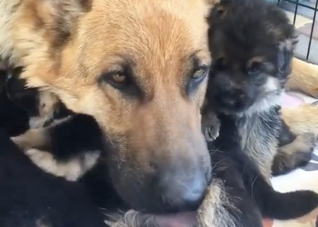 「ママ、重いっ!」コロコロ子犬を枕にしちゃう母犬。