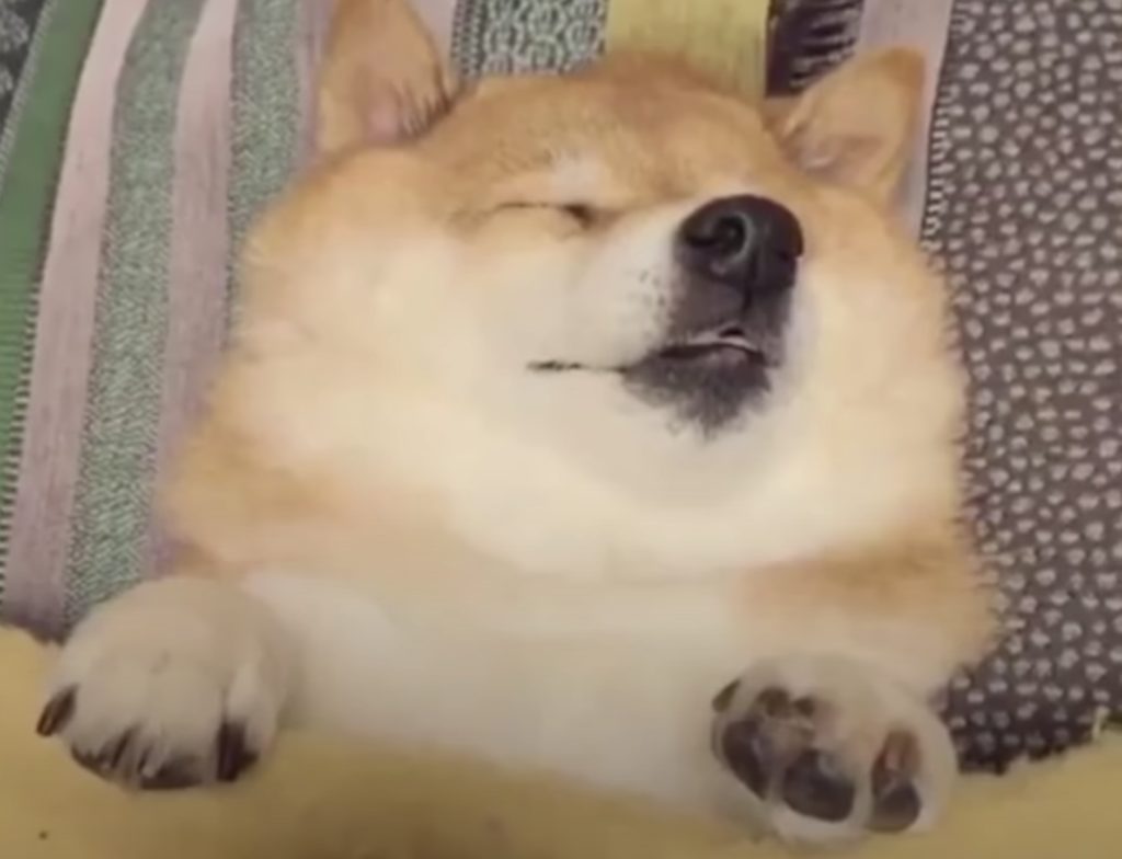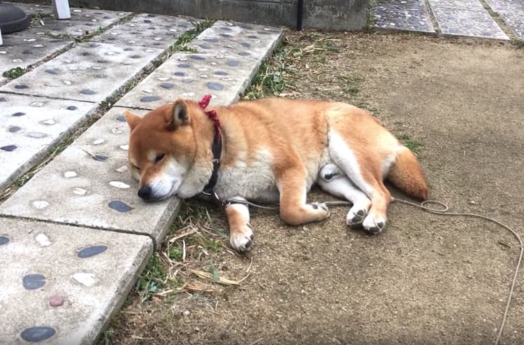 ダメだ…もう歩けない。ベッドまで辿り着けない柴犬。
