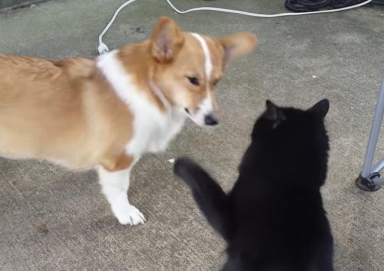 犬「ふふふ…そんなパンチじゃ痛くないもん」自ら黒猫に殴られにいくコーギー犬。