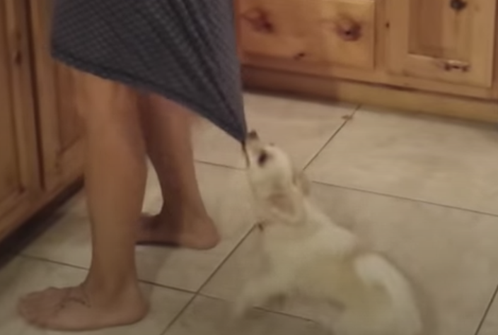 それ以上引っ張らないで〜! 愛犬がグイグイと飼い主のパンツを…