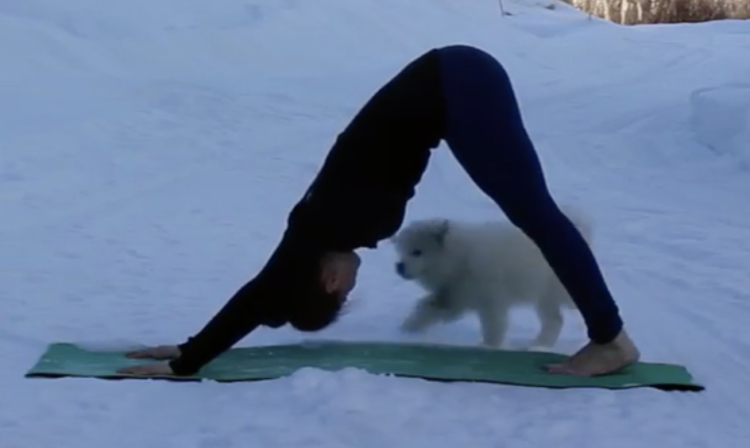 雪が一面広がる中で、ヨガをしている女性。 すると奥の方から真っ白な子犬がトコトコ。 「ご主人様〜なにしてるの〜?」と 下から潜り込んで女性に向かってチュ! 驚いた女性に、今度が正面からハグしてキス! か...可愛い。 女性にかまってほしかったんだ...