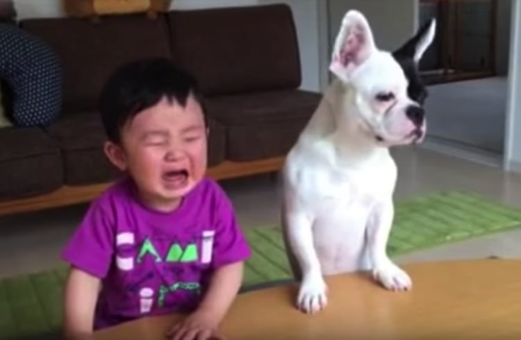 なんで?!赤ちゃんのおやつを横取りして一緒に泣く犬。