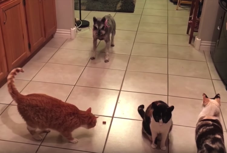 おやつを食べている猫さんたち、 一匹が食べ損ねておやつがコロコロ… それを見たワンコさん、すかさず近づきこっそりパクッ。 ささっと戻るのかと思いきや、抜き足さし足… 忍者みたいになるワンコさんなのでした。 -