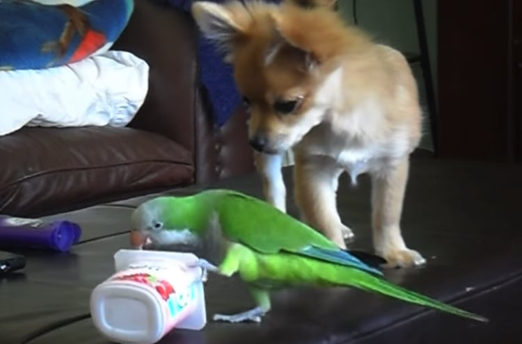ヨーグルトをついばんでいるインコさん。 それぼくのなんですけど…と奪い返すワンコさん。 これで決着?かと思いきや、 器用にカップを持って行くインコさん! ちょっと呆然としてしまうワンコさんなのでした。 -
