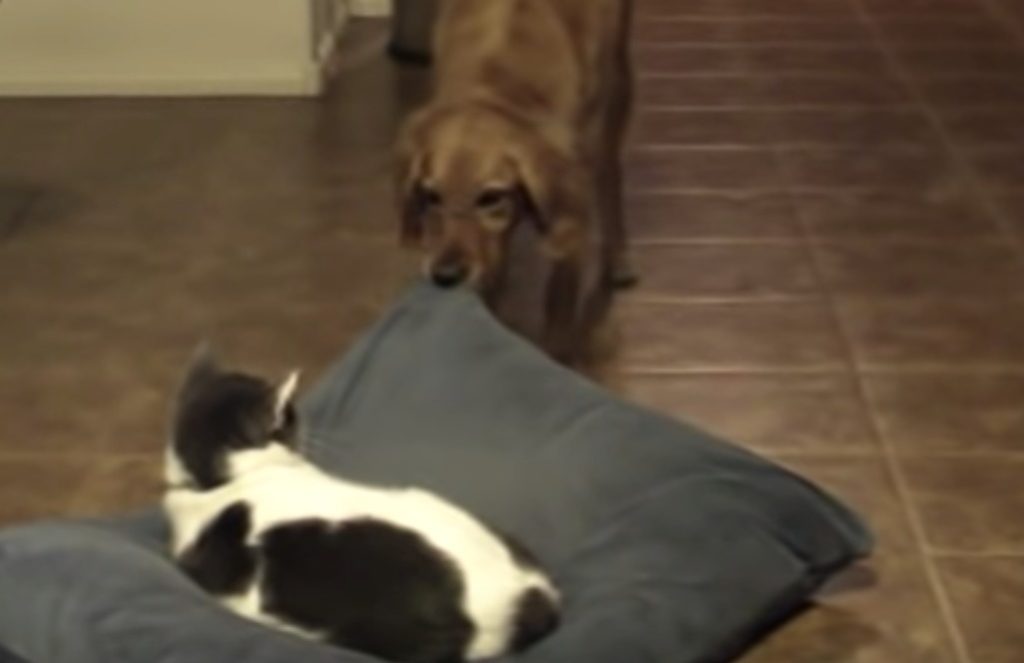 犬「それ僕のだもん!」ベッドを無断使用している猫に対抗して…