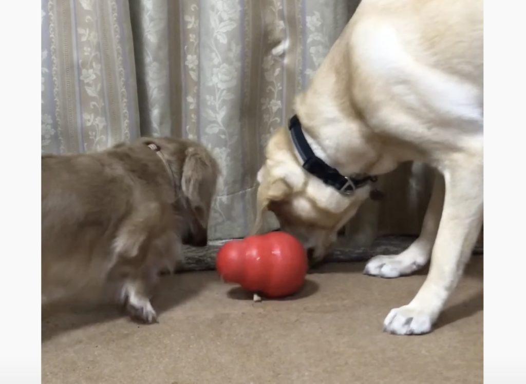 コロコロ転がすことでおもちゃが出てくる、 犬用の知育玩具であそぶ犬さん。 ただおやつを食べるよりも、 楽しめて一石二鳥♪なアイテムですが、 犬さんがコロコロ〜!とおもちゃを転がし 「ようやくおやつが出てきた!」と 思った次の瞬間...。 そばでその... -