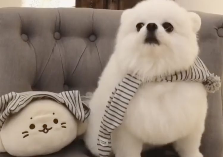 お揃いの服を着てデュエット♪ぬいぐるみに合わせて歌うポメ。