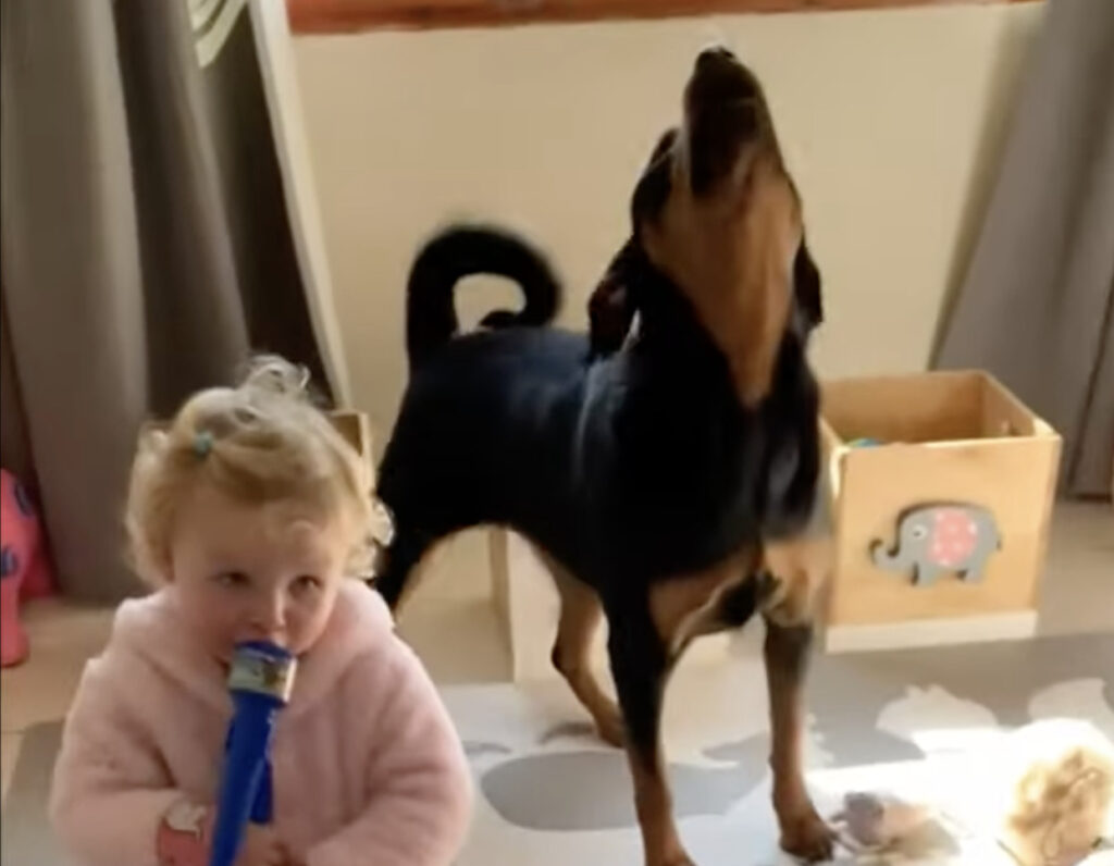 子供達の遊びに付き合ってあげるという 犬さんの姿を時々見かけますが、 無理して相手をしているというよりも、 犬さん自身もものすごく楽しんでいそうな そんな楽しそうな映像がありました♪ マイクスタンドを持って、 大きな声で歌っている女の子。 その...