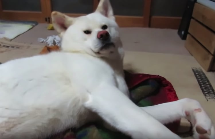 毛布の上に横たわっている秋田犬のゆうきさん あったかくてふわふわ、いい気分になってきているようで 寝る時間になり飼い主さんからサークルに戻るように言われるも サークルには戻りませ〜ん!っとこの表情。 のらりくらりかわしてからの拒否、可愛すぎ... -