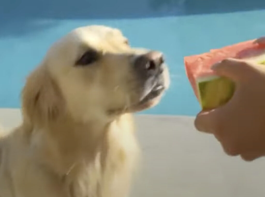 ほうほう、これがスイカですか? 初めて見たゴールデンレトリバーの反応。