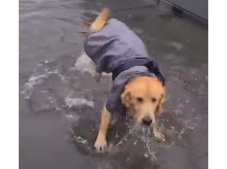 レインコートを着てる意味がぁ…! 水溜りを発見して大はしゃぎな犬さん。