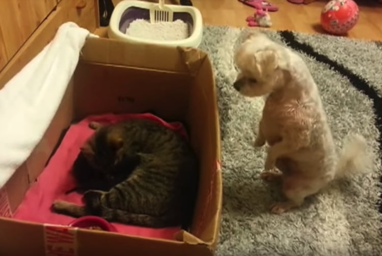 箱の中を恐る恐る覗いて、じーっ… ワンコさんが見つめる先にいたのは 母猫さんと、小さな子猫さんたち! きみたちは誰なの? と興味津々 とっても可愛い光景なのでした。