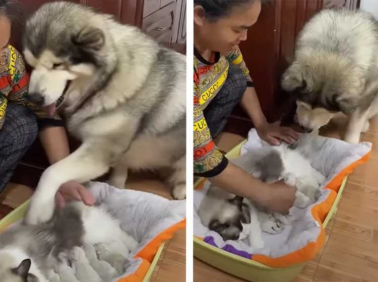 ちょっとでいいから触らせて!子猫を撫でてみたいハスキー犬。