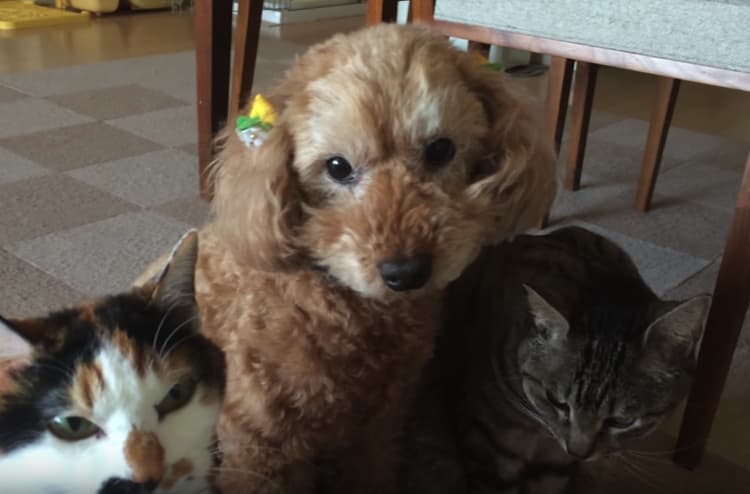 猫さん二匹に挟まれてストーブにあたる、 トイプードルの正太郎さん。 おもむろに前脚を舐めて顔をあらい… って、あれ?! ワンコ…? 一緒に育ったからうつっちゃったのかな? 猫化が止まらないワンコさんなのでした。 出典:chocolat -