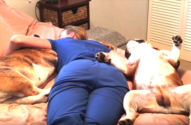 おかえりなさ〜い!お留守番していたワンコさんたち、 飼い主さんが帰ってきて大喜び。 でも、飼い主さんはもうお仕事後でクタクタ… じゃあ一緒に寝るよっと川の字になるワンコさん、 優しくって愛らしい、幸せの図なのでした。