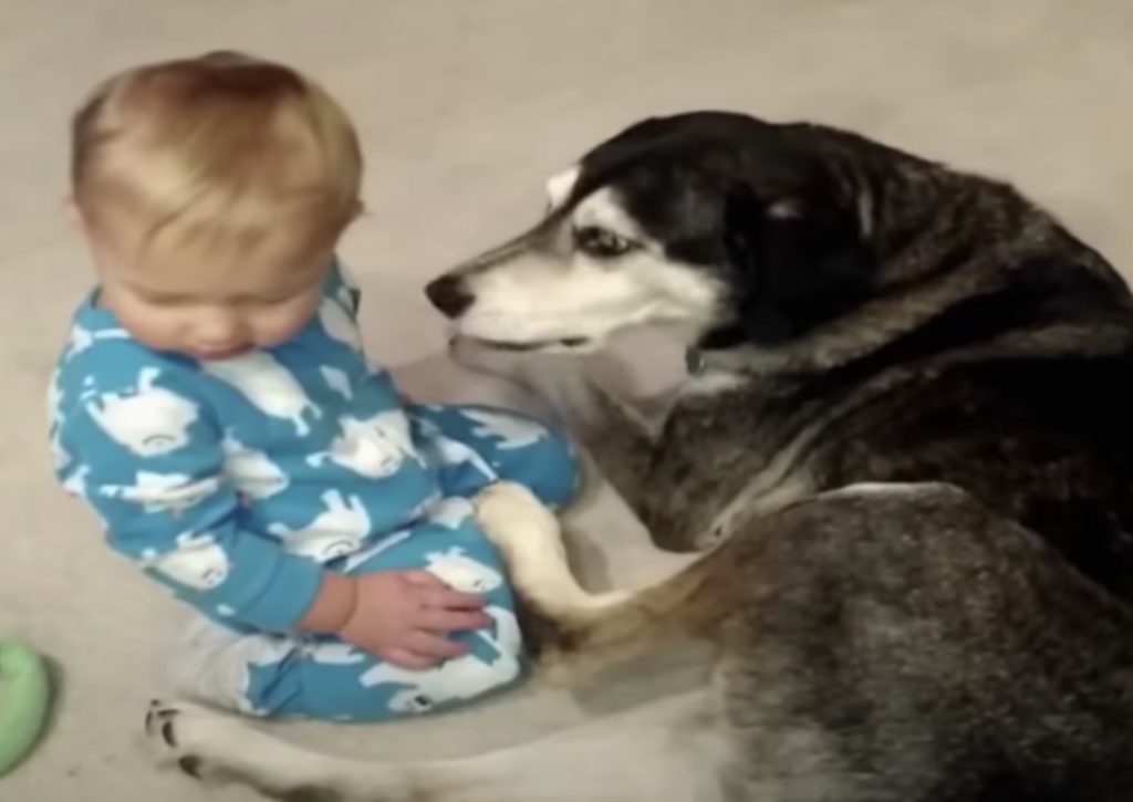 うとうと眠たい赤ちゃん、それを見たハスキー犬が優しい行動に。