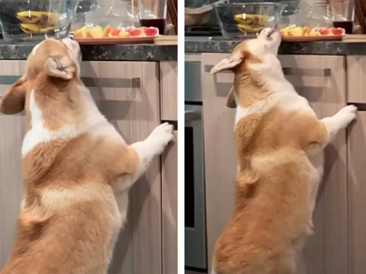 キッチンでつまみ食いする犬、足が短いのにどうやってカウンターに?