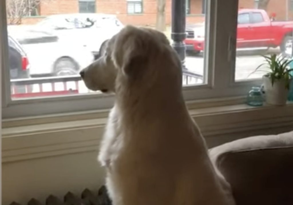 窓際に座って、外を見つめる犬さん。 学校に行っている子供たちが もうすぐ帰ってくる時間になったので 「まだかな〜?もうすぐかな?」 と待っているようです。 窓の外を人が通っても、 自分が待っている子達じゃないと 全く反応しない犬さん。 ところが...