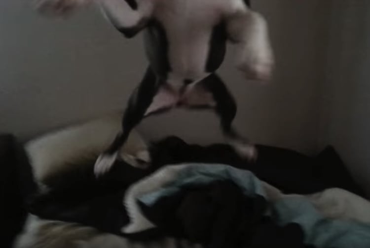 わっほ〜い!ベッドの楽しさに気づいた犬。