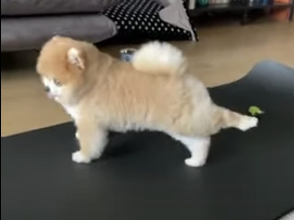 「砂かけのポーズだわん」ヨガマットの上で運動を始める可愛いワンコ。