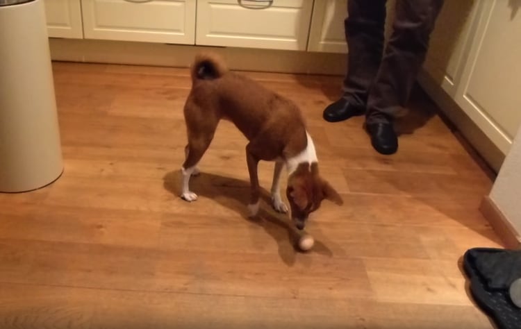 予測不能な動きにパニック!転がる卵に驚くワンコ。