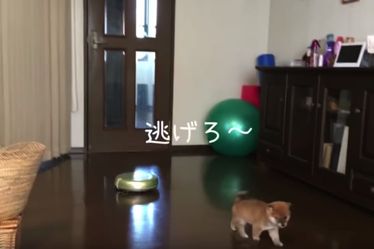 うわ〜こっちに来た!まだまだお掃除ロボが苦手な柴犬子犬。