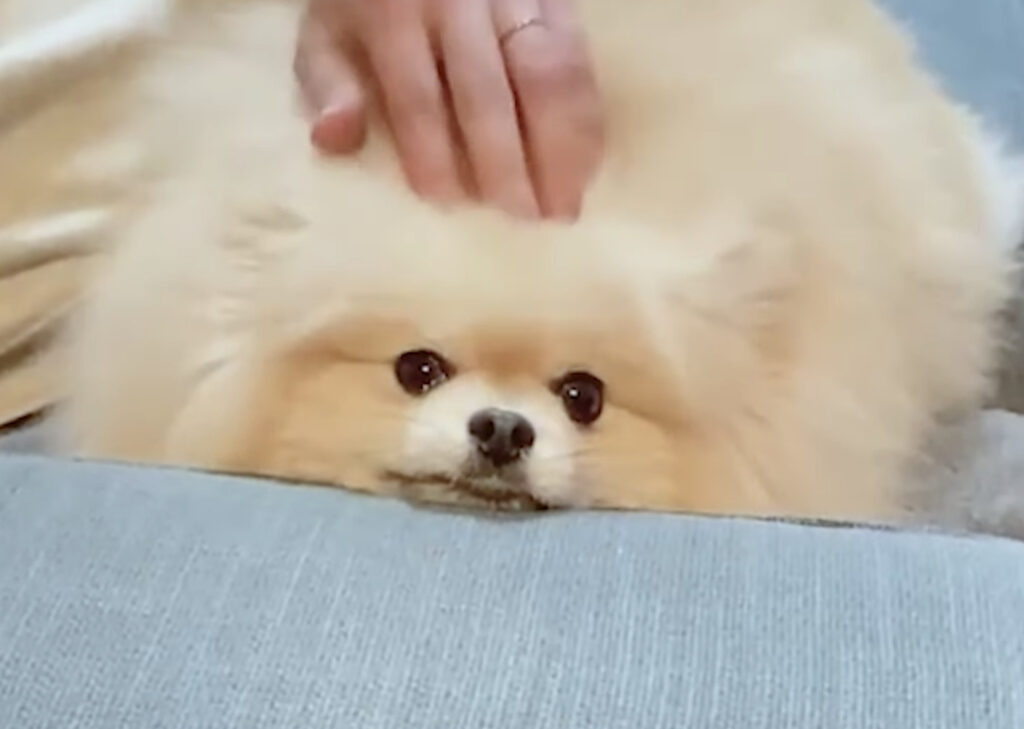 もふもふっぷりが最高に可愛い ポメラニアンのモチちゃん。 この日は飼い主さんと一緒に ソファに座ってまったりタイム♪ 肘置き部分にちょこんとアゴのせしているのが たまらない可愛さです♪ モチちゃんの頭をナデナデする飼い主さん。 しばらくは普通に撫...