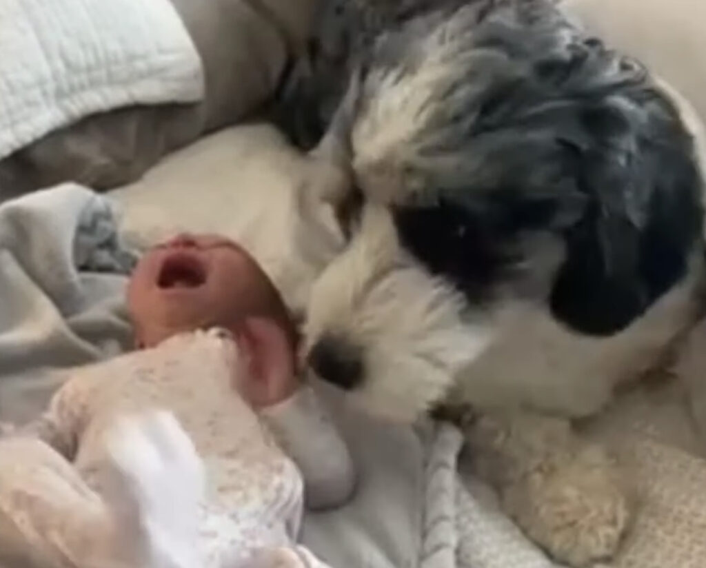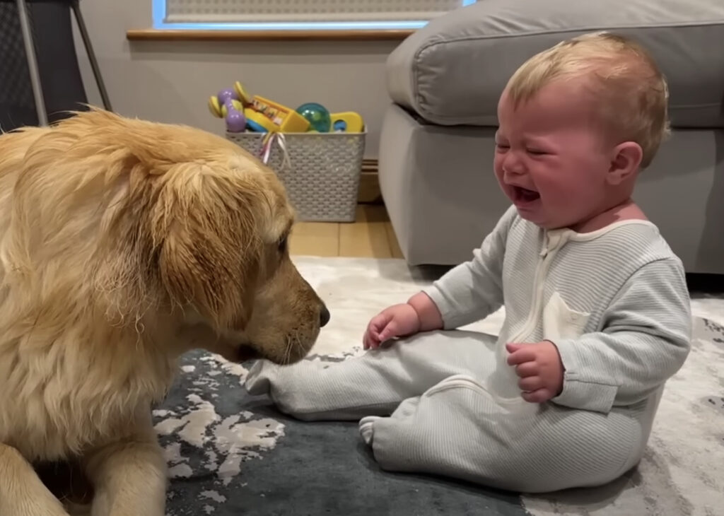 ご、ごめんね!!赤ちゃんを泣かせて大慌てする犬。