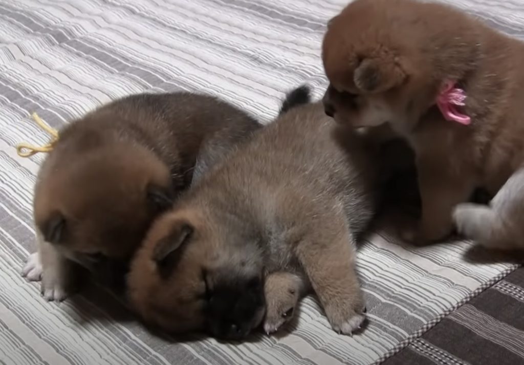 ゴハンの時間だよ〜!と ママ犬さんにミルクをもらう柴犬の子犬たち。 みんな元気にゴクゴク飲んでいますが、 あれ? 1匹だけミルクを飲みにこない子が。 青い首輪をつけた子犬さんは どうやらものすごく眠かったようで ゴハンの時間になっても気づかずに... -