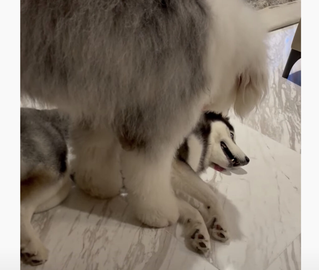 起こし方が雑すぎる! 寝ているハスキーの上に大きなモフモフ犬が…