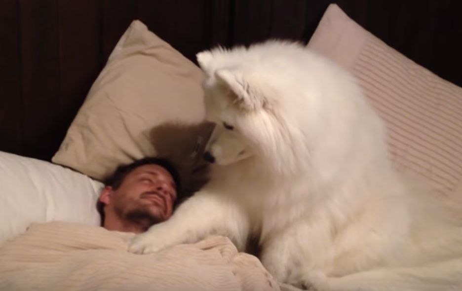 真っ白もふもふのサモエド犬。 ご主人に起きてもらいたくてあの手この手で頑張ります。 肩をトントンしたり、鼻をツンツンしたり、 ダイレクトに顔に手を当ててみたり… 早く散歩に行きたいよう〜!の気持ち、伝わります。 [youtube https://www.youtube.co... -