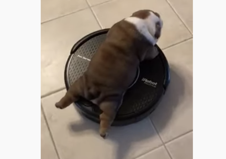 降りられる? お掃除ロボットにされるがままのブルドッグの赤ちゃん。