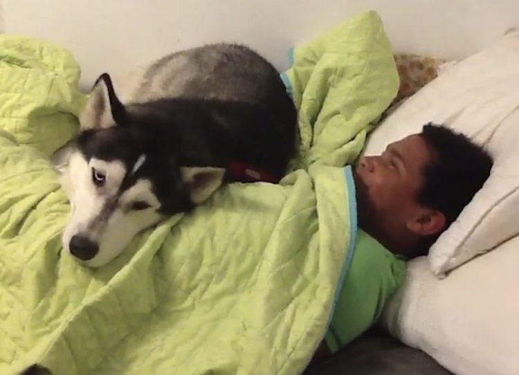 朝、起きる時間になって母親が男の子を起こしにきました。 ところが、なぜかハスキー犬さんが 「まだダメ! 起きちゃダメ!」と起床を阻止! 母親が毛布に触れるだけで、「ガウガウ!」 よっぽど起きて欲しく無いみたい。 もう、このまま一緒に寝たいです...