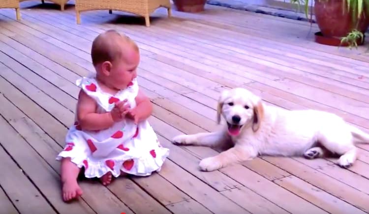 赤ちゃんを見て大はしゃぎ!とっても嬉しそうな犬さん。