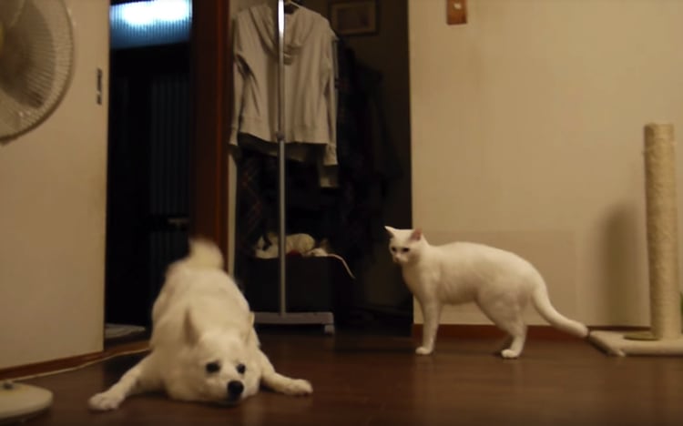 降参ポーズ?猫さんに文句を言われて戸惑っちゃう犬。