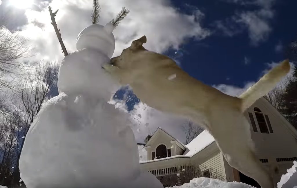 雪だるまを破壊するワンコ。気持ちいいくらいの壊しっぷり!