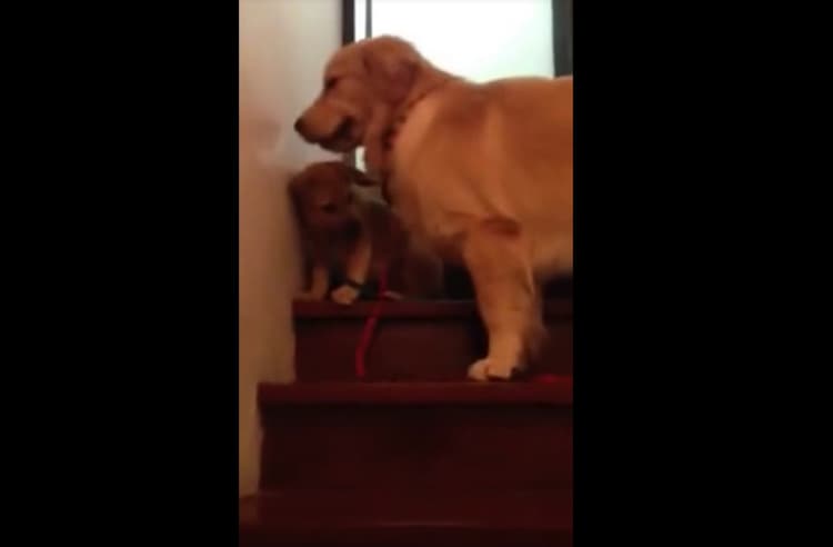 スパルタ母ちゃん?!子犬に階段の降り方を教えるも…