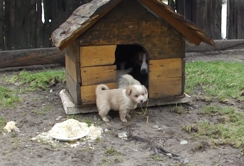 犬さん家族が住む小屋の前に置かれたゴハンと、 それを狙っているアヒルさんたち。 家族のゴハンを取られちゃ困る!と、子犬さんが ひとりで勇敢に立ち向かいますが... やっぱりちょっと怖い〜。 途中で兄弟が小屋から出てきて、 加勢してくれるかと思いき... -