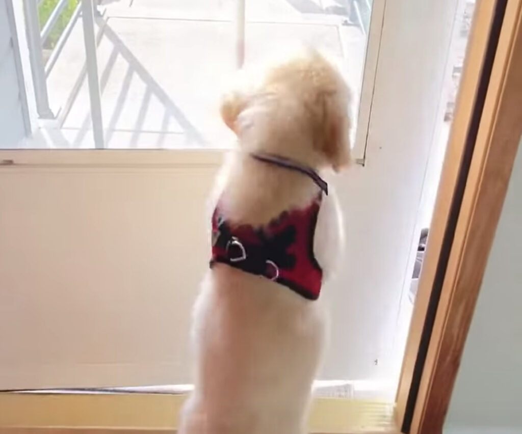 子犬「パパおかえり〜!」自力でドアを開けて出迎えようと頑張る!