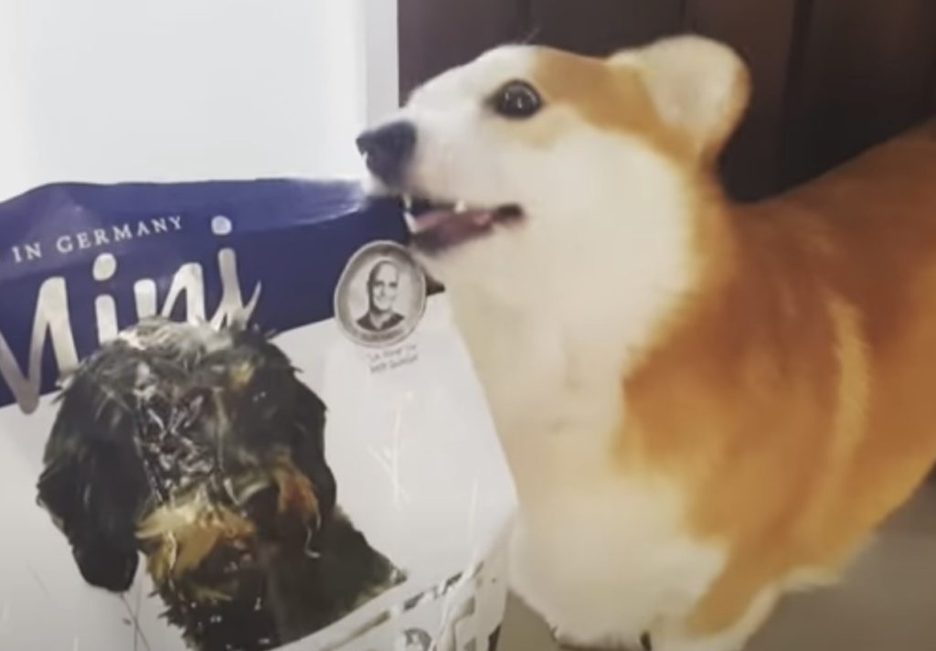 このドッグフードが食べたいの!力づくで袋を開けようとするコーギー。