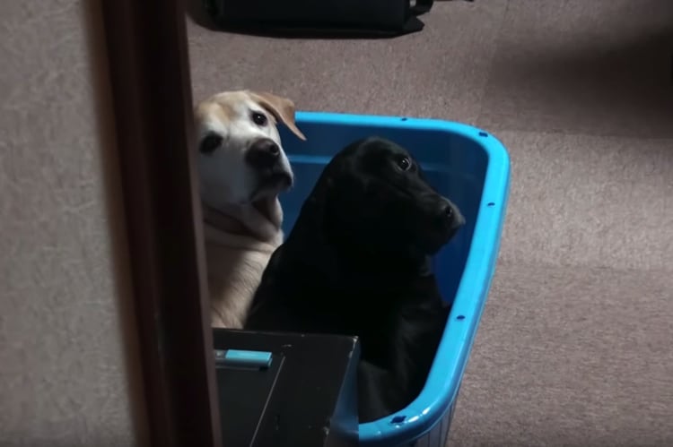 ラブラドールのムックさんとラムさん 飼い主さんに入っちゃダメだよ?と言われますが そう言われると逆に入りたくなる…!! ついつい入ってしまう二匹、猫鍋ならぬ犬たらい? 飼い主さんが入ってきたときの表情にも注目です。 -